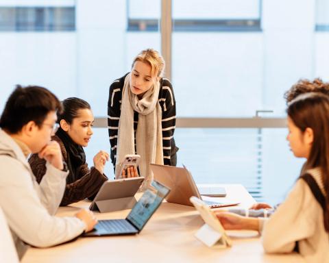 Trois étudiants collaborent sur un projet pédagogique à SKEMA Business School, illustrant l'impact de la taxe d'apprentissage sur leur formation, avec en arrière-plan un étudiant travaillant seul dans un espace dédié à l'apprentissage individuel