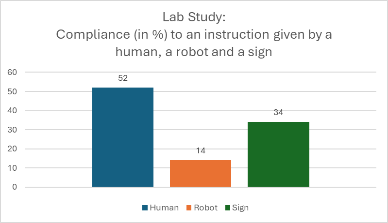 Interestingly, in one of our experiments, we found that people tend to follow instructions given by a sign more than those given by a robot (Figure 2). This suggests that the absence of human is not the problem, but the perceived justice.