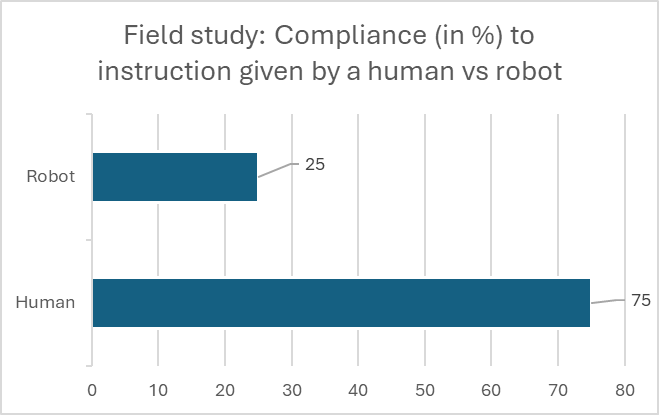 It’s true that we’re not used to receiving instructions from robots, and habits do play a role in compliance, we grow up learning to follow orders from humans and signs. We tested this by measuring participants’ perception of novelty, and even after accounting for how new or unfamiliar they found the robot, the effect remained.