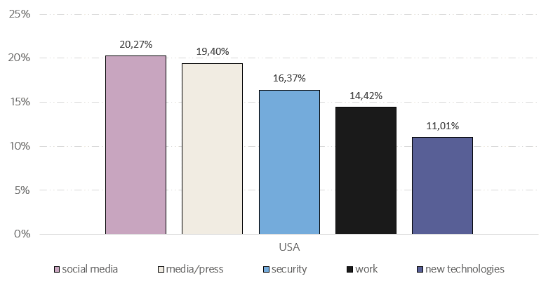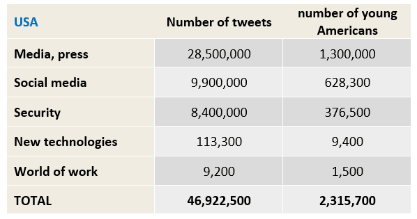 Young Americans are also prone to mention the state and the government, with more than 1.1 million tweets associating such expressions with ‘media/press’. This is the first words’ association among our selection of keywords.