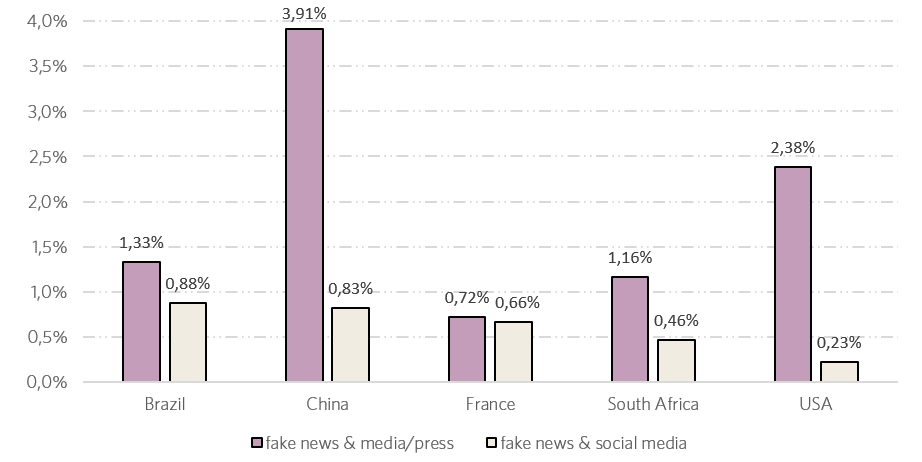 When talking about the media and the press, the term ‘fake news’ is also widely used, appearing in 671,400 tweets. It is the second most recurring term. The association of the words ‘media’ and ‘manipulation’ generates 35,400 tweets (between 1 May 2020 and 30 April 2021). Moreover, #FakeNews and #FakeNewsMedia are popular hashtags associated with this theme. Young Americans’ tweets associate ‘fake news’ to ‘media/press’ more than 10.5 times than to ‘social media’.