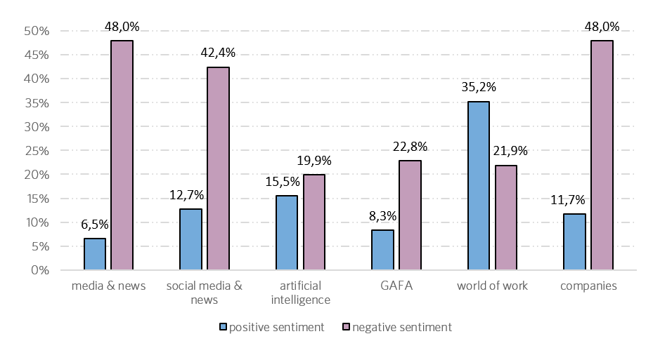 While criticising traditional media, young Americans remain lucid as to the reliability of the information accessible via social networks. Indeed, a strong negative sentiment emerges from the association of the expressions ‘social media’ and ‘news’ (42.4% of tweets); however, not as strong as the one associated with traditional media.